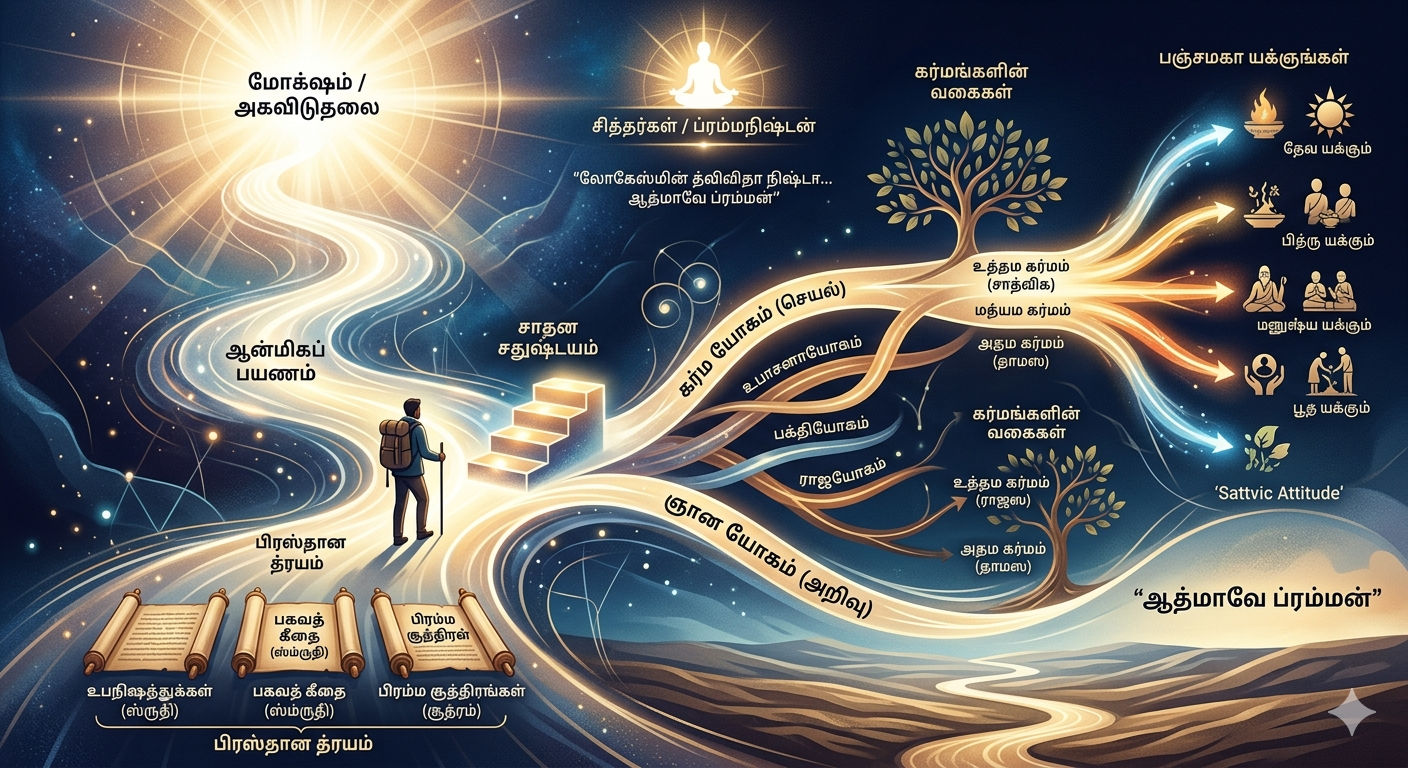 எனவே கிருஷ்ணரின் கூற்றுப்படி இருப்பது இரண்டே இரண்டு யோகங்கள்தாம். கர்மயோகம், மற்றும் ஞானயோகம். விளக்குவதற்கு வசதிக்காகவும், ஒரு குறிப்பிட்ட யோகம் எம்முறையில் பயிலப்படுகின்றது என்பதைப் பொறுத்தும் அவற்றுக்கு வெவ்வேறு பெயர்கள் கொடுப்பது வழக்கத்தில் இருந்து வருகின்றது. எனவேதான் ராஜயோகம், பக்தியோகம், உபாசனாயோகம் என்ற பிரிவுகளும் பேசப்படுகின்றன. ஆனால் சிந்தித்துப் பார்த்தால் மேற்கூறப்பட்ட மூன்று யோகங்களையும் கர்மயோகம் என்ற பிரிவுக்குள் அடக்கி விடலாம்.