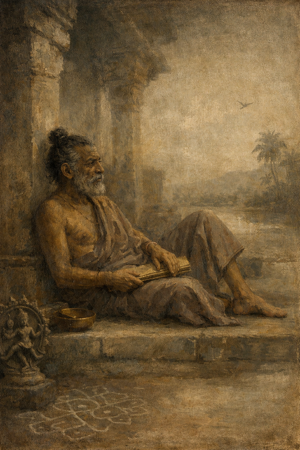சுவரோரம் கிடந்த சூரல் நாற்காலியில் சாய்ந்து, தெருவை மேய்ந்தவாறு அமர்ந்திருந்தார் கும்பமுனி. கால்களிரண்டும் படிப்புரையின் மூன்றடி உயர காப்புச் சுவர் மீது கிடந்தன. பாம்பணையில் துயில்கின்ற அரங்கன் எனும் மிதப்பு மனதில். அரைவேட்டி முட்டுக்குக் கீழே முழு சுதந்திரத்துடன் கற்பழிக்காத கனவான்கள் கழகத்தின் கட்சிக் கொடிபோல் அசைந்து கொண்டிருந்தது “அவரவர் அடிசில்”