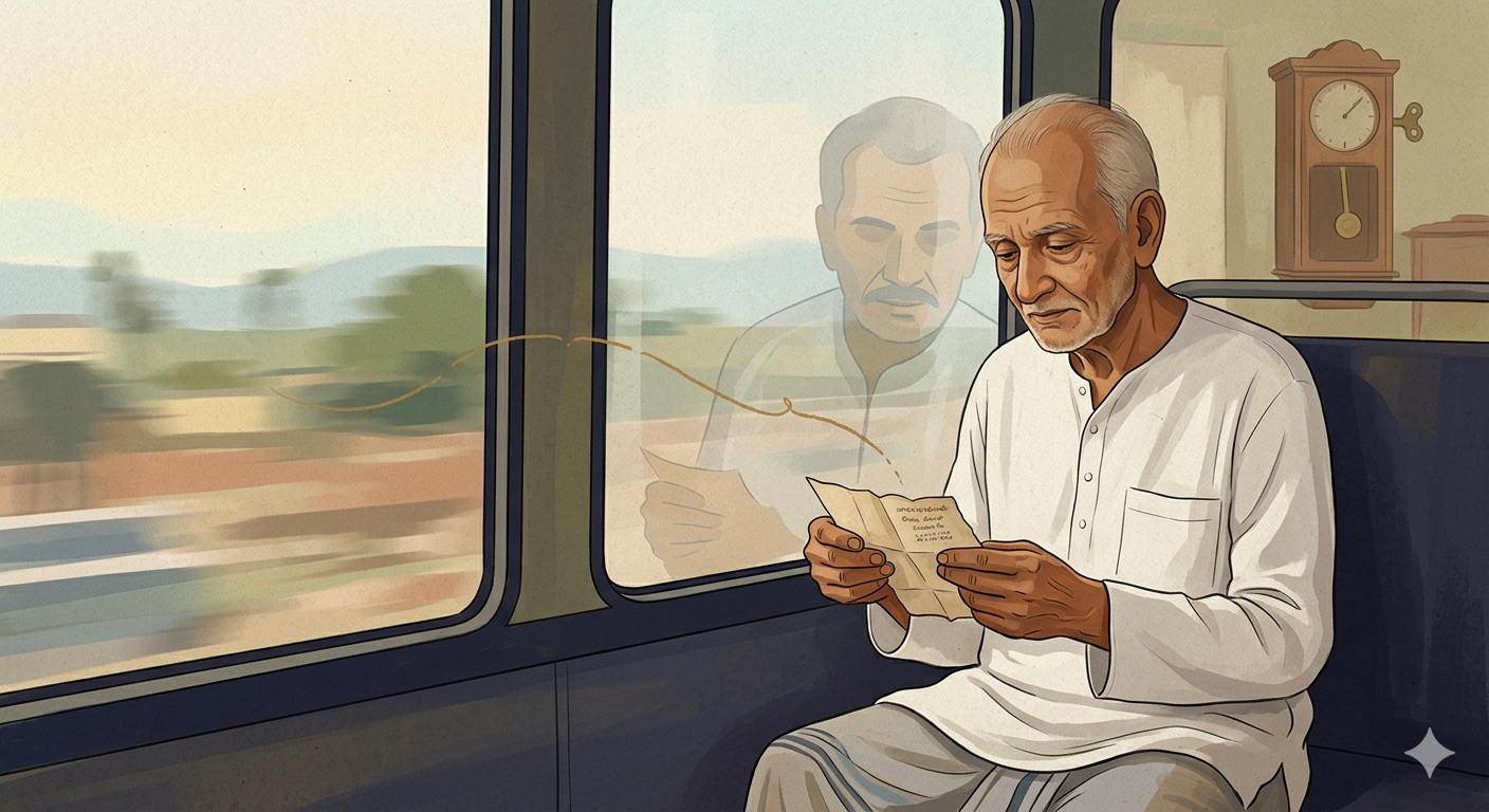 மதிய நேரக் குட்டித் தூக்கத்திலிருந்து, அம்மா ஓர் உந்துதல் உணர்வோடு கண் விழித்த போது, ஜன்னலினருகே கிடந்த அழுக்கான, கசங்கிப் போயிருந்த ஒரு துண்டுச் சீட்டைப் பார்த்தாள். மதியச் சூரியனின் புழுதி படர்ந்த காற்றின் வேகத்தில் ஒரு கடிதம் துருப்பிடித்த ஜன்னல் கம்பிகளினூடே உள்ளே வந்து விழுந்திருந்தது. ஹரிதாசன் வீட்டிற்கு வருகிறான். அந்தச் சீட்டின் “மதியம்”