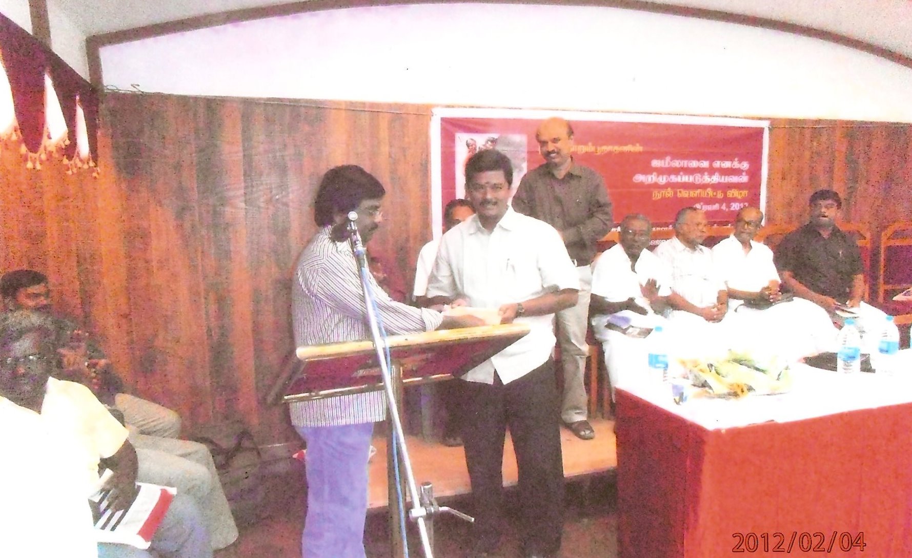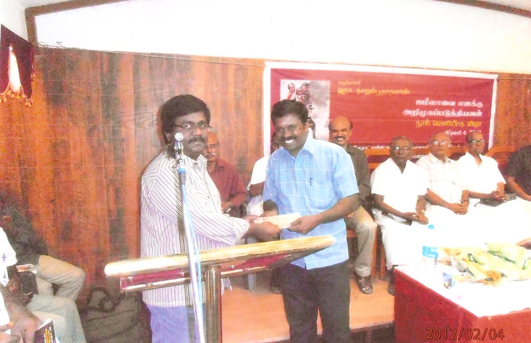 ஜானகிராம் ஹோட்டலின் மாடிப்படிகளில் அவசர அவசரமாக ஏறினோம். விழா நடைபெறும் வாசலில் நாறும்பூநாதனும், க்ருஷி ஸார்வாளும் நின்று கொண்டிருந்தனர்.‘தம்பி, இன்னும் ஒங்க காலு சரியாகல போல தெரியுதெ!’ க்ருஷி ஸார்வாளின் தொண்டை வழியாக ஹெரான் ராமசாமி என்னிடம் அக்கறையாகக் கேட்டார்.‘எல்லாரும் வந்தாச்சு.உள்ள வாங்க’.கைபிடித்து அழைத்துச் சென்றார் நாறும்பூநாதன்.உள்ளே தி.க.சி தாத்தா, தோப்பில் முகம்மது மீரான் அண்ணாச்சி, நாவலாசிரியர் டி.செல்வராஜ் ஐயா, வண்ணதாசன் அண்ணாச்சி போன்றோர் அமர்ந்திருந்தனர்.நீண்ட வருடங்களுக்குப் பிறகு நான் பார்த்த ’வானம்பாடி’ சங்கர் சித்தப்பாவின் அருகில் போய் உட்கார்ந்து கொண்டேன்.மேடையில் ‘திருவுடையான்’ தபலா வாசித்துக் கொண்டே அருமையாகப் பாடிக் கொண்டிருந்தார். மூன்று வருடங்களுக்கு முன்பு மதுரை புத்தகக் கண்காட்சியின்போது திருவுடையானின் கச்சேரியைக் கேட்டு ரசித்து, அவரிடம் பேசிக் கொண்டிருந்த ஞாபகம் வந்தது. தாளவாத்தியம் வாசித்துக் கொண்டே பாடுவது என்பது லேசுப்பட்ட காரியமல்ல. முயன்று பார்த்தால்தான் தெரியும். பலமுறை முயன்று கேவலப்பட்டிருக்கிறேன்.(அதேபோலத்தான் ஒரு கையில் மணியும், மற்றொரு கையில் தீபாராதனையும் காட்டுவது. முயன்று பார்த்துவிட்டு சொல்லுங்கள்).திருவுடையானுக்கு முன்பே ‘கரிசல் குயில்’ கிருஷ்ணசாமி பாடிவிட்டதாகச் சொன்னார்கள். அவர் குரலைக் கேட்க முடியாமல் போனதில் வருந்தினேன். திருவுடையானைப் பற்றி ஒருமுறை இளையராஜா அவர்களிடம் சொல்லிக் கொண்டிருந்தேன். ’ஸார், திருவுடையான்னு ஒரு பாடகர். கம்யூனிஸ்ட் கட்சி மேடைகள்ல . . .’ நான் சொல்லிக் கொண்டிருக்கும் போதே இடைமறித்து, ‘ஆங், தெரியும். ‘விருமாண்டி’ பட்த்துல ‘கருமாத்தூர் காட்டுக்குள்ளே’ பாட்டு பாட வச்சிருந்தேனே’ என்றார்.